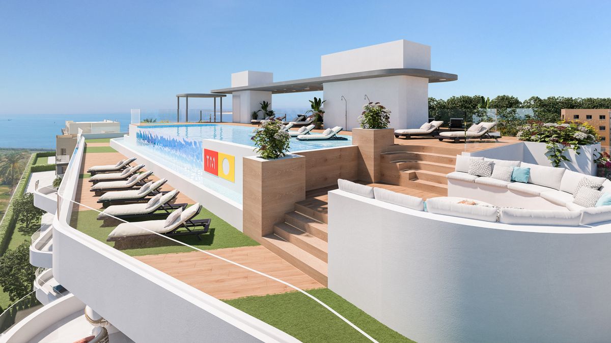 New luxury apartments just 300 meters from the beach. The building is located only 300 meters from Cala Piteras beach and just 8 minutes from Torrevieja Center. The urbanization will consist of a total of 36 homes with 2 or 3 bedrooms, 2 bathrooms, and extraordinary sea views from most of them. On the building's rooftop, there are common areas for relaxation along with a pool to admire the beautiful sunrise or sunset, such as an Infinity pool with 3 water beds, a jacuzzi with a relaxation area. In the lower garden areas, there will be an adult pool and a children's paddling pool.