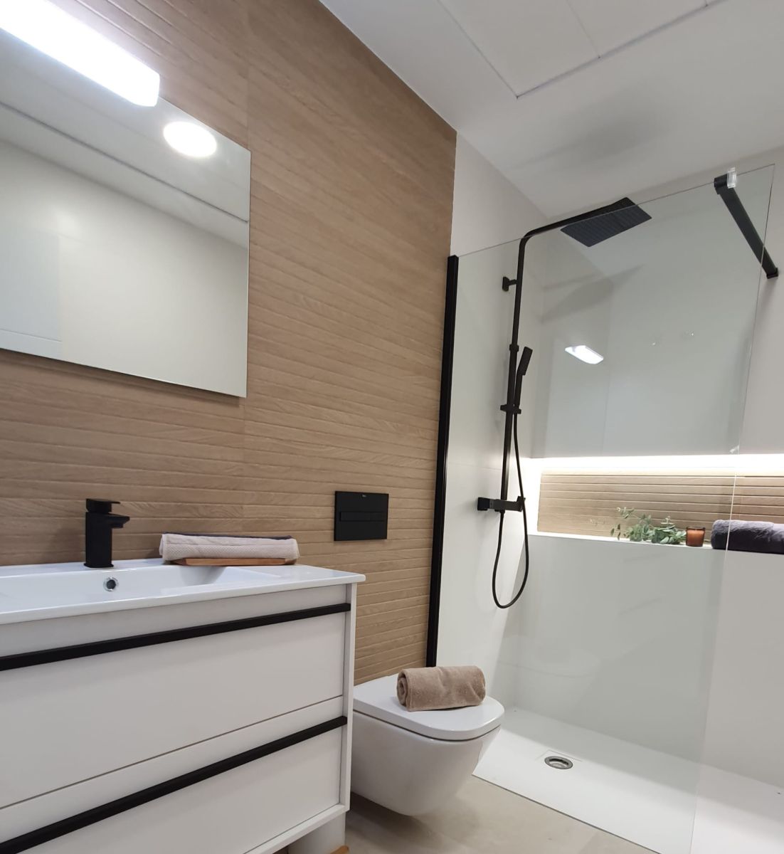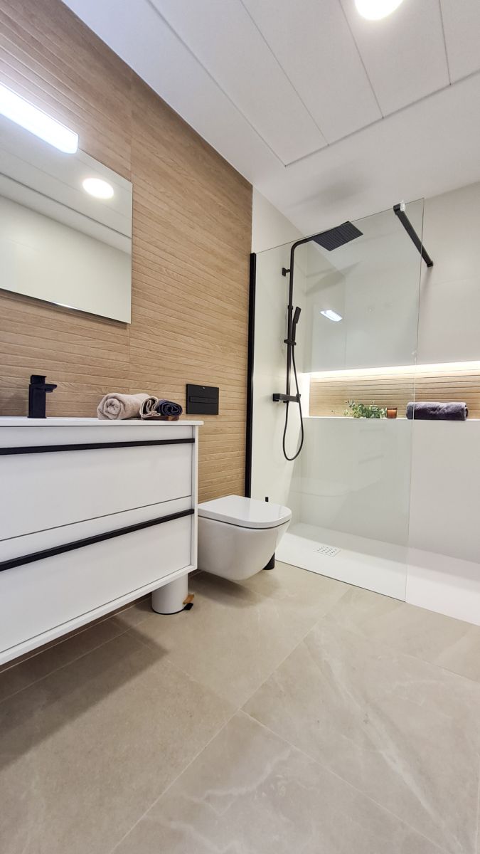 - Fully equipped bathrooms with vanity unit, wall-hung toilet with built-in cistern, mirror, rain shower, and shower screens.