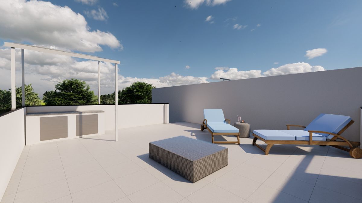 These beautifully designed homes offer comfortable interiors, where two double bedrooms on the first floor have access to a front balcony and a rear sun terrace. On the ground floor, there are terraced areas, while the top floor boasts a large solarium with a summer kitchen, perfect for relaxation and outdoor gatherings.