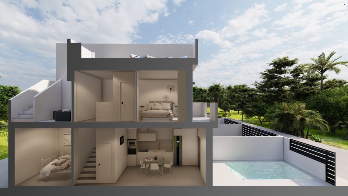 Luksusowy kompleks składa się z pięciu eleganckich domów szeregowych w Dolores de Pacheco, Murcia. Każdy z nich posiada trzy sypialnie i dwie łazienki, oraz prywatnym ogrodem z przodu i basenem.